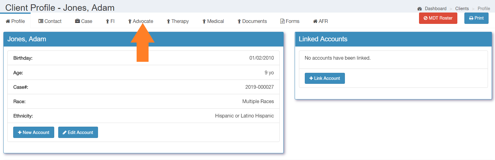 Click on the "Advocate" tab in the client's profile