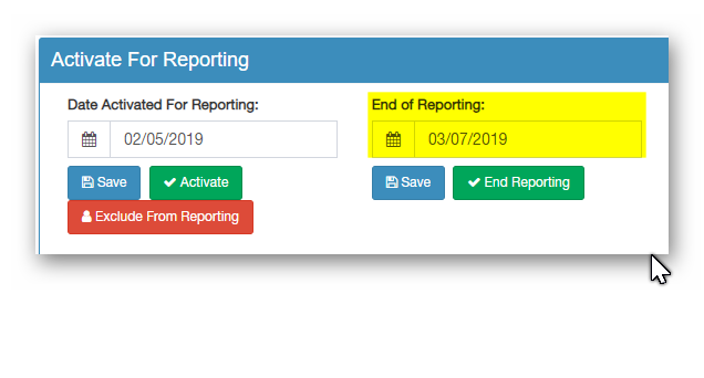 To set an "End of Reporting" date, simply enter the date by using the calendar, or entering it directly into the "End of Reporting" text box. You can also click on "End of Reporting" to enter today's date, then click "Save."