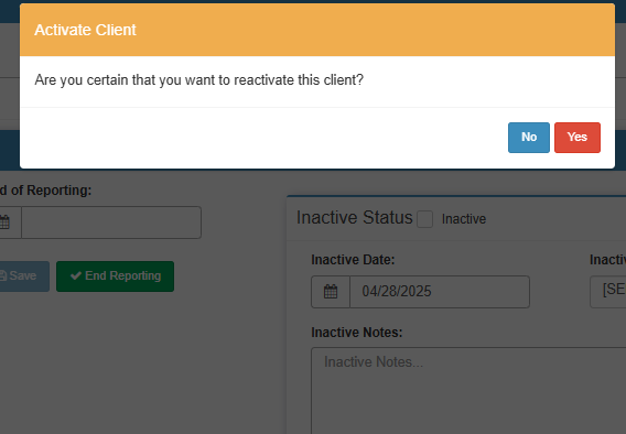 If a client returns to your agency for additional services on a case that is marked as "Inactive," uncheck the "Inactive" box in the AFR tab. You will be prompted to confirm that you wish to reactivate the client. Make sure "End of Reporting" is empty as well so activity will be included in reports.