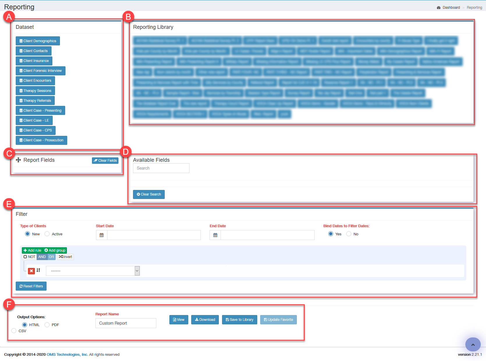 - Output Options: This section allows you to choose how you would like to export the report, as well as options to save (to the report library), download or update (an already saved report).
