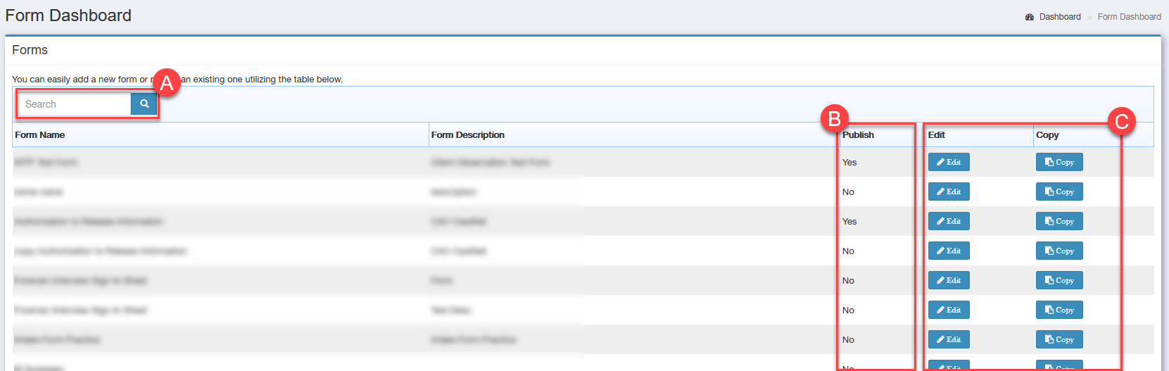Step 2. Once your page reloads you will be on the Form Dashboard page. From here you can search all the previously created forms for your center (A), view all forms (B), view their publish status (C), as well as edit/copy a specific form. The copy function allows you to create an exact duplicate of the form, to save you time in case a secondary form is similar to the initial.