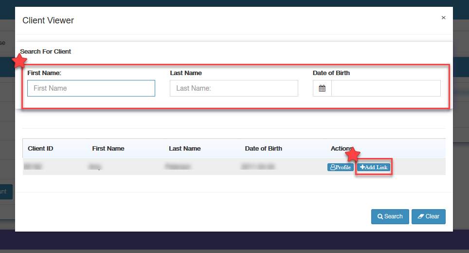 Step 2: Once on the Client Profile where you would like to capture the group copy, you first must ensure you have the other clients (that you would like to copy the encounter to) set up as a 'Linked Account' (Fig. 1). To link one account to another, simply press the Link Account button, search for the client you would like to link up, and press the Add Link button (Fig. 2).