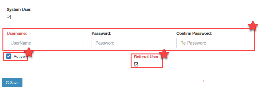 Step 4: Fill in the username and password information for the user. Important: To define a user as a referral user you must check the referral user box and ensure the active box is checked.
