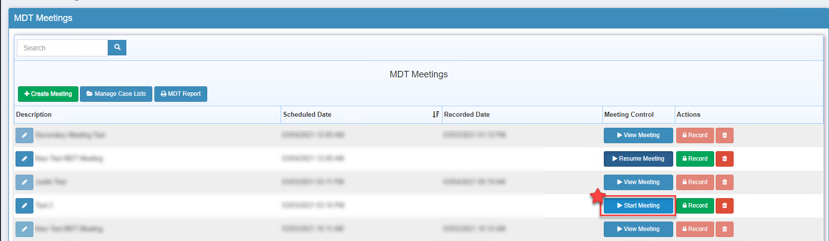 Step 5. Once back on the MDT Manager page, find the meeting you just created and press the Start Meeting button to begin your meeting.