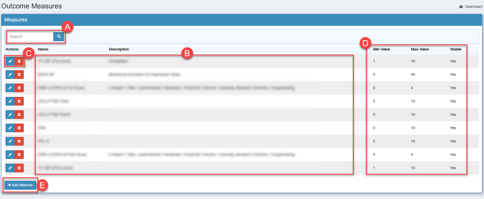 Step 2. Once on the outcome measures page you can search through previously added measures (A), view all currently added measures (B), Edit/Delete a measure (C), and view each measure's values and visibility status (D). To add a brand new measure press the 'Add Measure' button (E).