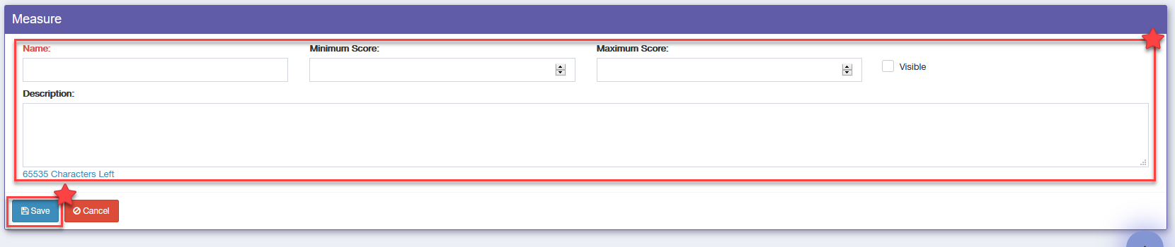 Step 3. After pressing the add measure button a new section will populate at the bottom of your page. In this section fill out all the fields for your new measure. After entering in your measure information and checking the 'Visible' checkbox, press the 'Save' button.