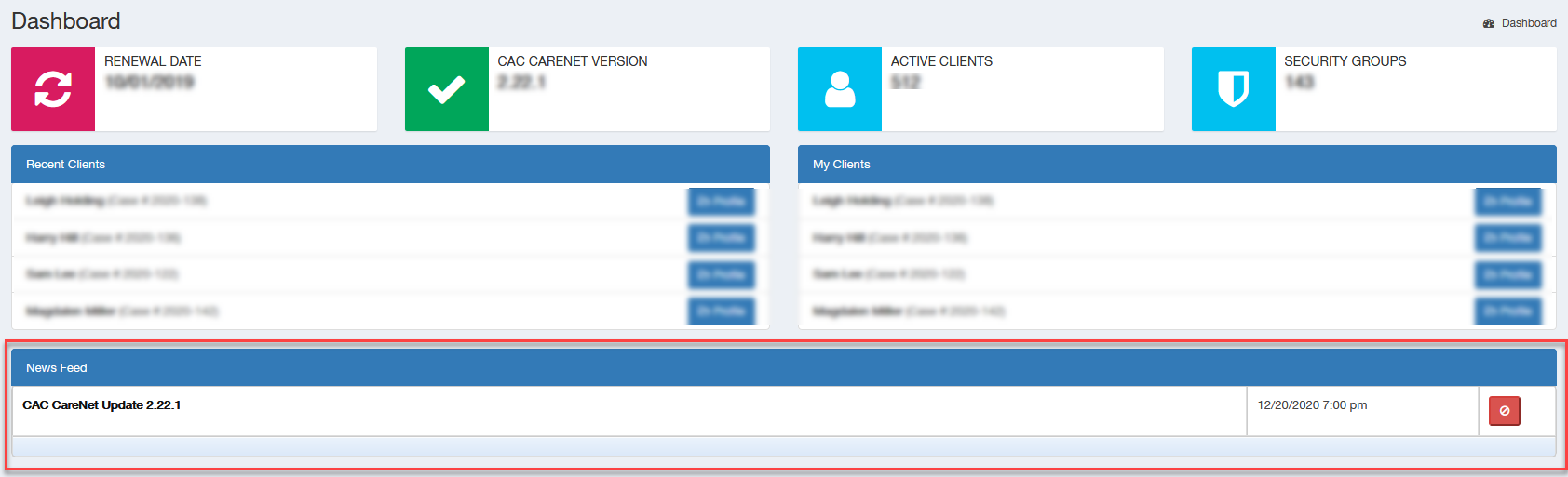 Within CAC CareNet we now offer a news feed on your dashboard. The news feed provides you with updates, fixes, or announcements regarding CAC CareNet. Using the News Feed section is an easy process.